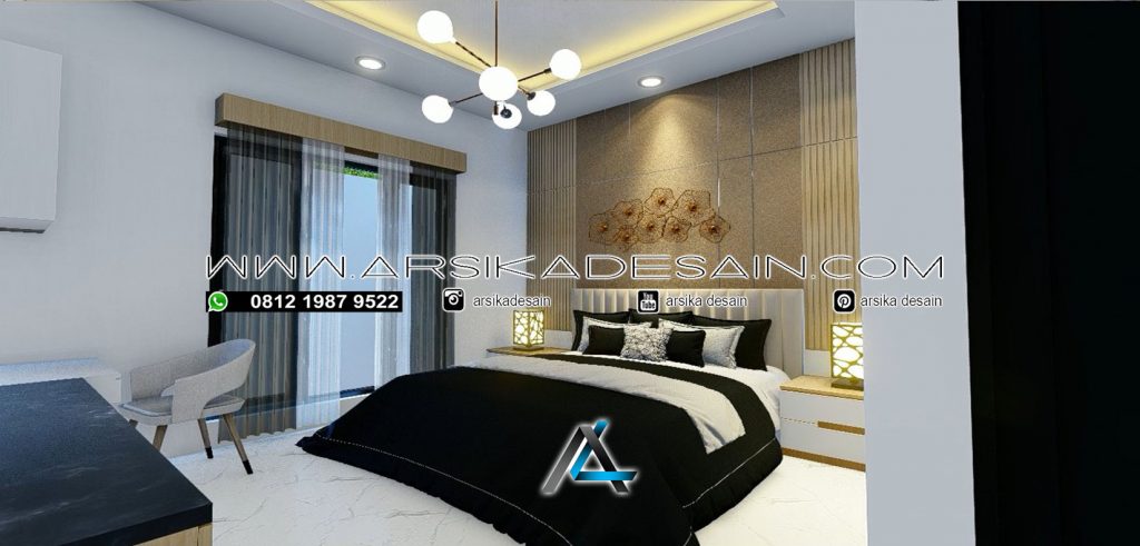 Kita memasuki ruang tidur utama berukuran 4 x 3,5 meter, Kamar tidur ini tampil modern minimalis dengan sentuhan elegan, kelihatan rapi tapi tetap cozy buat istirahat maksimal. Dominasi warna netral hitam, putih, dan beige bikin suasana tenang, dipadu headboard empuk berpanel plus aksen dinding tekstur yang jadi statement tanpa berlebihan. Pencahayaan dibuat layered—lampu gantung modern, downlight, dan lampu meja—jadi vibes-nya hangat dan mewah tipis-tipis. Adanya kamar mandi dalam berukuran 2 x 2 meter, dengan disediakan partisikaca sebagai skat area shower dan wastafel ya gengs