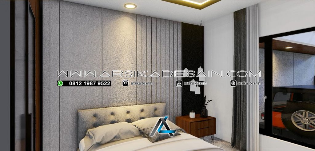Kita memasuki ruang tidur 1 berukuran 4 x 4 meter, Kamar tidur ini punya vibes calm dan cozy yang pas banget buat istirahat total. Dominasi warna netral abu-abu dipadu tekstur dinding yang estetik bikin suasana tenang tapi tetap modern. Headboard empuk, lighting warm yang soft, plus aksen kayu di nakas bikin kamar terasa hangat dan nyaman. Simpel, rapi, dan kelihatan clean—tipe kamar yang bikin betah rebahan lama.