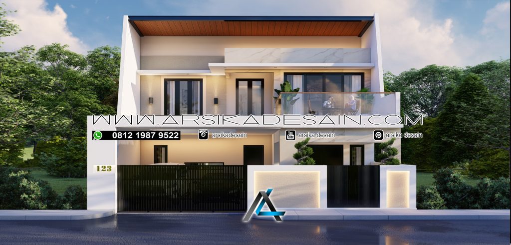 Desain rumah modern dua lantai di lahan 180 m² dengan fasad tegas dan elegan mengusung konsep Kontemporer. Fasad rumah memiliki garis geometris kuat, warna netral, tekstur batu marmer, dan pencahayaan hangat untuk kesan mewah.